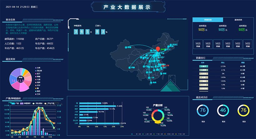 产业数据大屏展示模板 大数据统计看板,这一个产业数据统计的大屏展示模板,只有一个页面,动态展现各产业的各项指标数据。