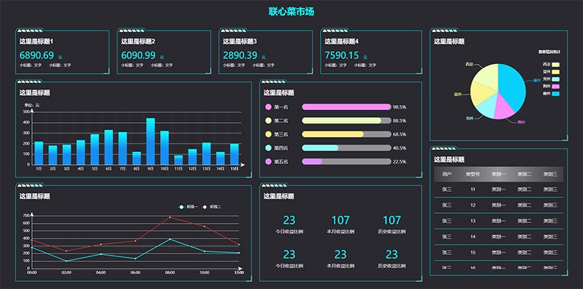 联心菜市场可视化数据大屏模板下载,此数据大屏包含各种图表,动态管理展示菜市场的数据变化。