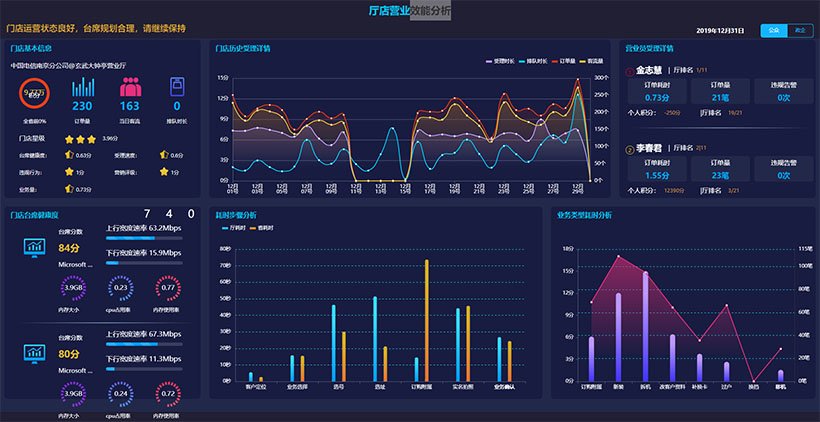 门店运营效能分析Html模板 可视化数据大屏展示模板,此模板为电信营业厅的可视化数据大屏,可应用到门店大数据管理以及电商订单大数据管理大屏。