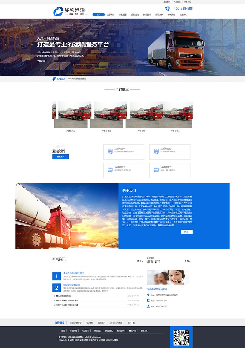 物流运输公司网站模板 货物快递网站模板下载,PbootCMS内核开发的网站模板,该模板适用于货物运输、汽车贸易、快递物流等企业,当然其他行业也可以做,只需要把文字图片换成其他行业的即可;PC+WAP,同一个后台,数据即时同步,简单适用!附带测试数据!