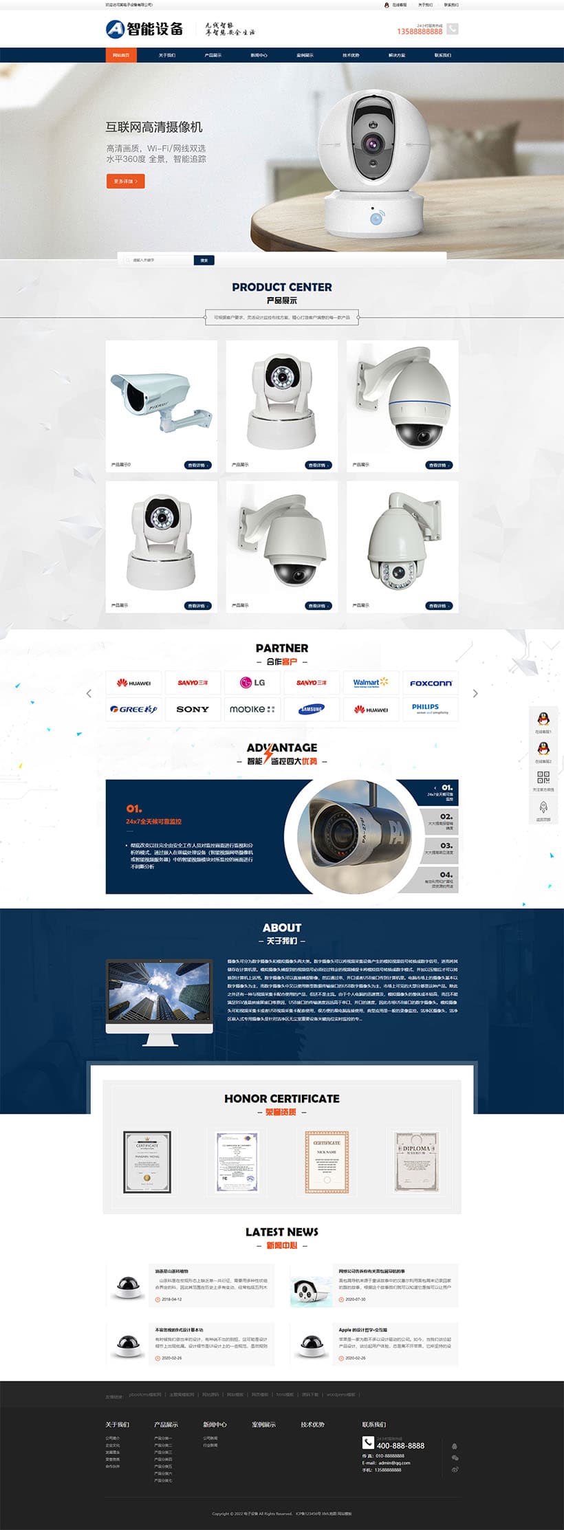 (自适应手机端)响应式智能摄像头设备pbootcms网站模板 蓝色安全防盗电子探头设备网站源码下载,PbootCMS内核开发的网站模板,该模板适用于智能摄像头网站、安全防盗设备、电子产品网站模板等企业,当然其他行业也可以做,只需要把文字图片换成其他行业的即可;