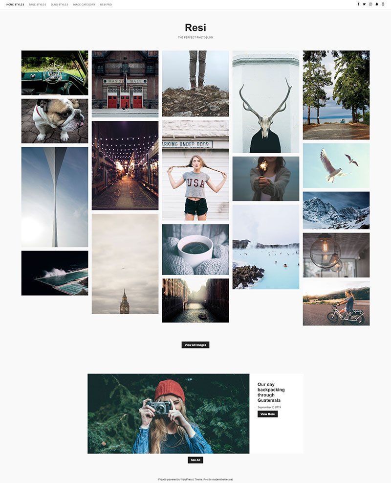 图片博客WordPress主题 很适合做相册的模版,这是一款超极好看的WordPress摄影相册主题,它适用于投影工作者或是作为图片展示的Wordpress网站,响应式部局,无缝支持手机、平板、电脑,并且页面使用了无刷新加载,用户体验非常的棒。